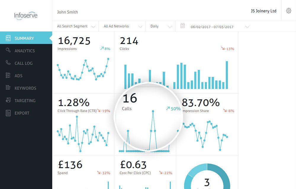 Easy to understand PPC dashboard, showing phone calls and conversions.